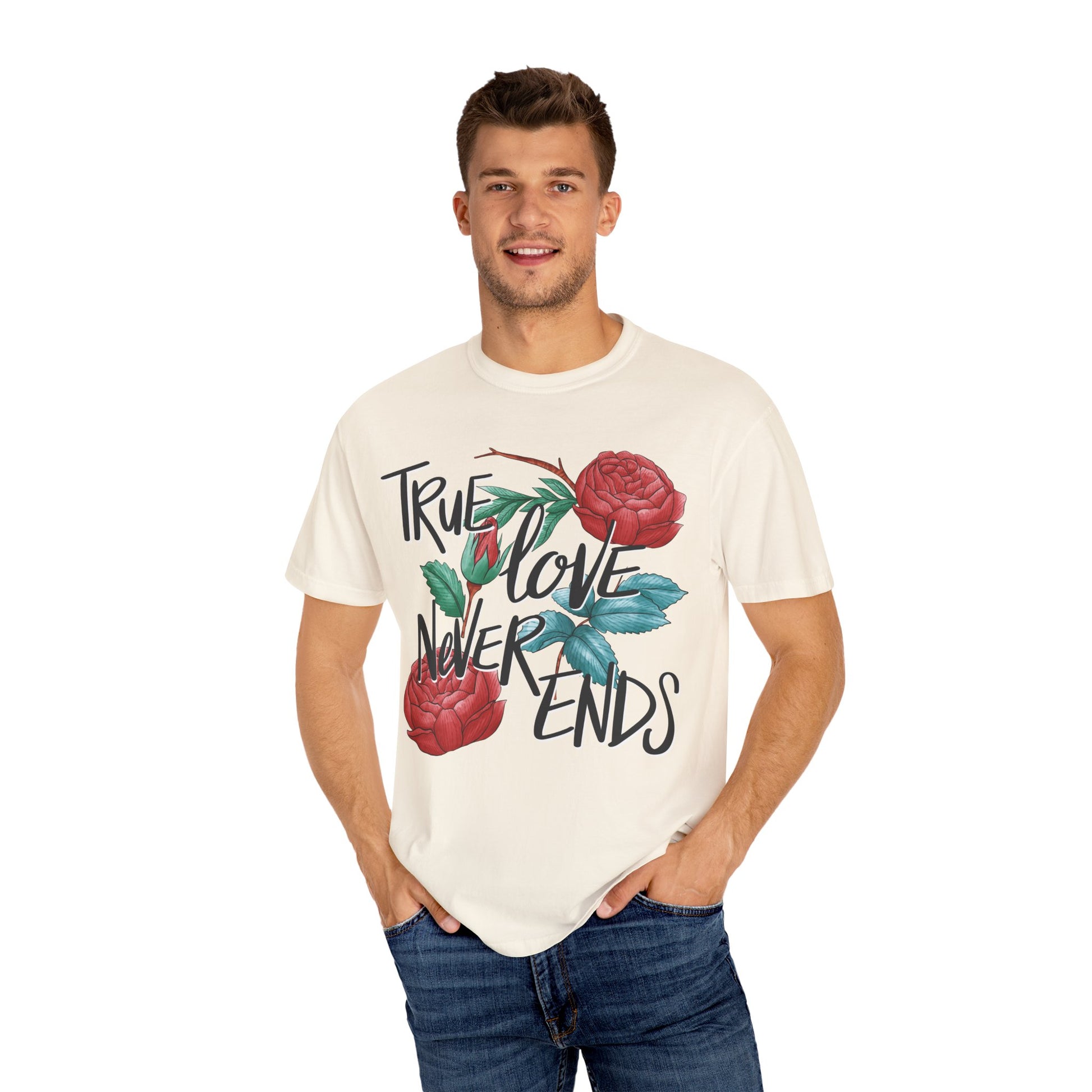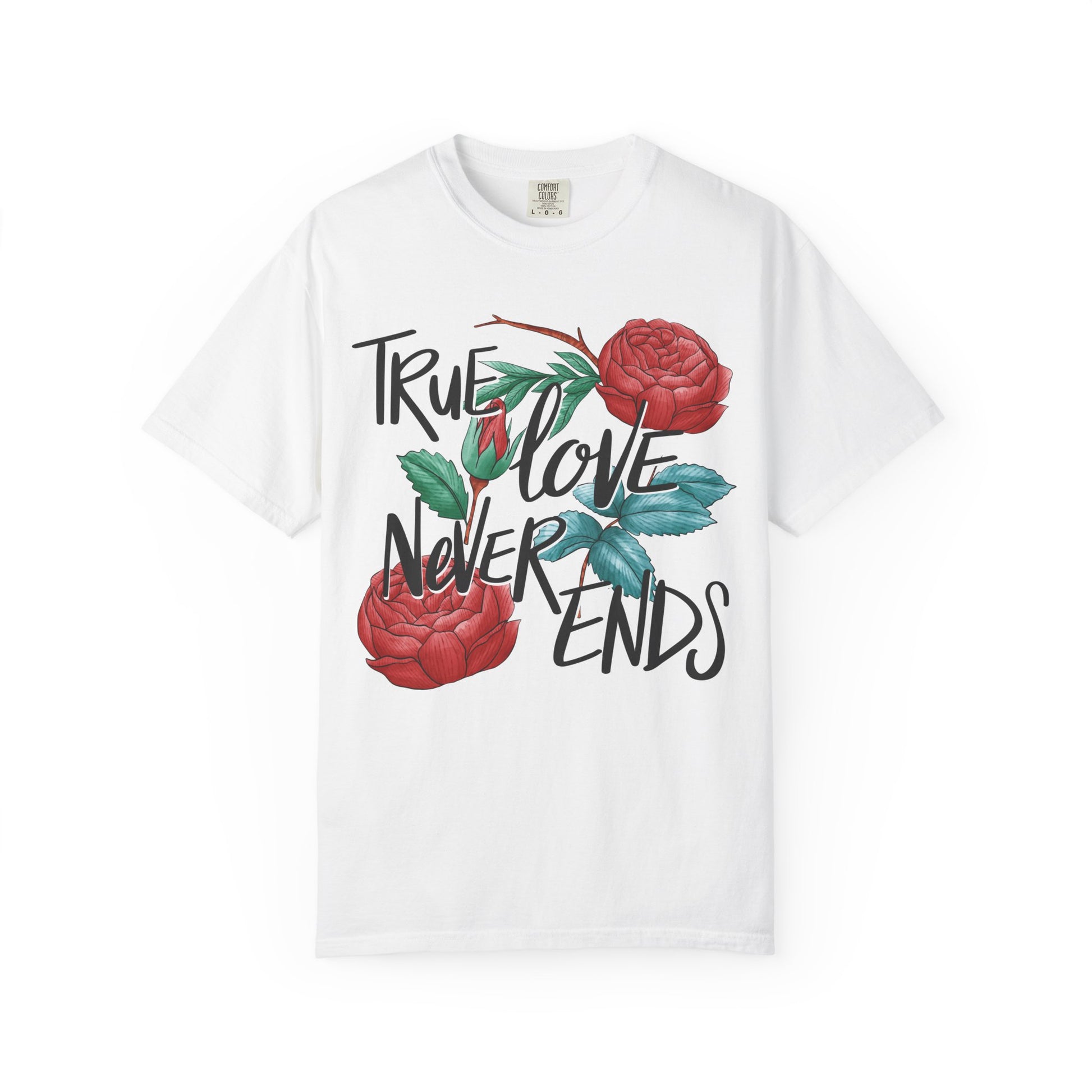 Celebrate timeless connection and effortless style with the True Love Never Ends Floral T-Shirt. Featuring bold typography intertwined with beautifully illustrated red roses, this unisex tee captures the essence of everlasting love and artistic expression.